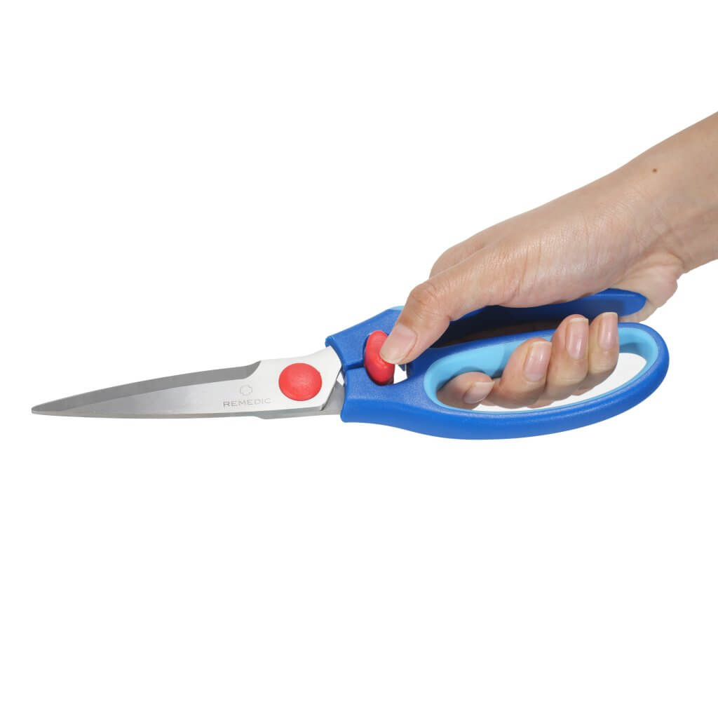 Remedic Scissors with Table Stand feature a universal, adaptive design that supports safe, hands-free cutting for everyday household tasks. The scissors sit securely in a tabletop stand and include a non-slip mat to improve stability and control. The adaptive press-down cutting action and spring-loaded blades reduce hand strain, allowing comfortable one-hand use or operation with the palm, elbow, or forearm. Sharp stainless steel blades cut paper, cardboard packaging, fabric, and pill blister packs with ease. The scissors can also be removed from the stand and used as a regular handheld pair, making them a versatile, universally designed cutting solution for the whole family.